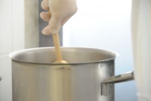 Versare in una pentola l’Acqua, Sale, Zucchero, Burro e Pasta d’Arancio. Scaldare quindi l’impasto a fuoco lento fino a portarlo a bollitura.3 Versate la farina nell’impasto e munitevi de “ojo de gumbio”